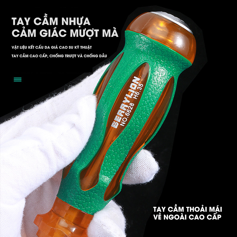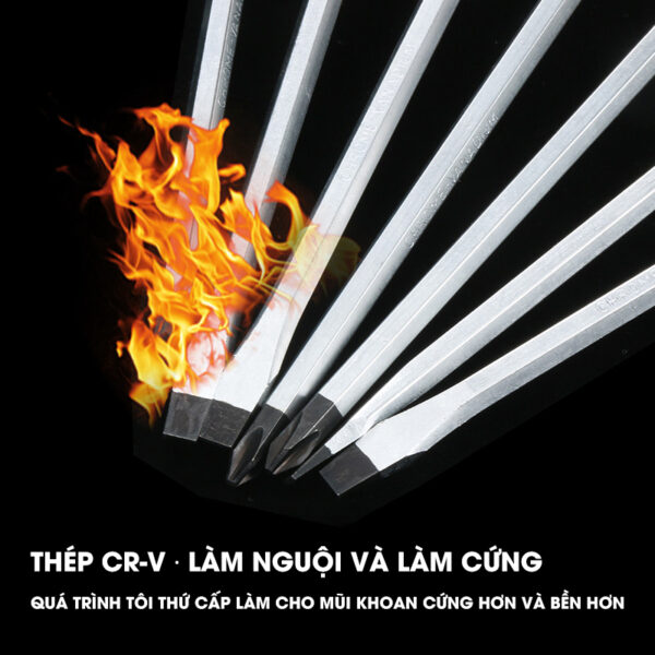 – Đầu tô vít có từ mạnh, độ cứng tổng thể 60 HRC, khả năng chịu lực tốt, chống xoắn, độ đàn hồi cao, được thiết kế xuyên suốt và tạo búa đập phía cuối chuôi